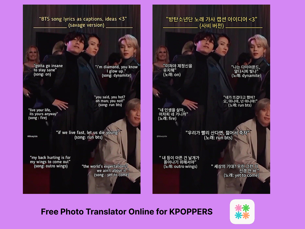Dzięki sztucznej inteligencji tłumacza obrazów z koreańskiego możesz przetłumaczyć plakat K-popu w kilka sekund. Prześlij zdjęcie książeczki albumu, a każdy wers tekstu piosenki, napisów końcowych i notatek w języku koreańskim stanie się czytelny w Twoim języku. Zrób zrzut ekranu odręcznego listu od idola i przetłumacz go natychmiast.