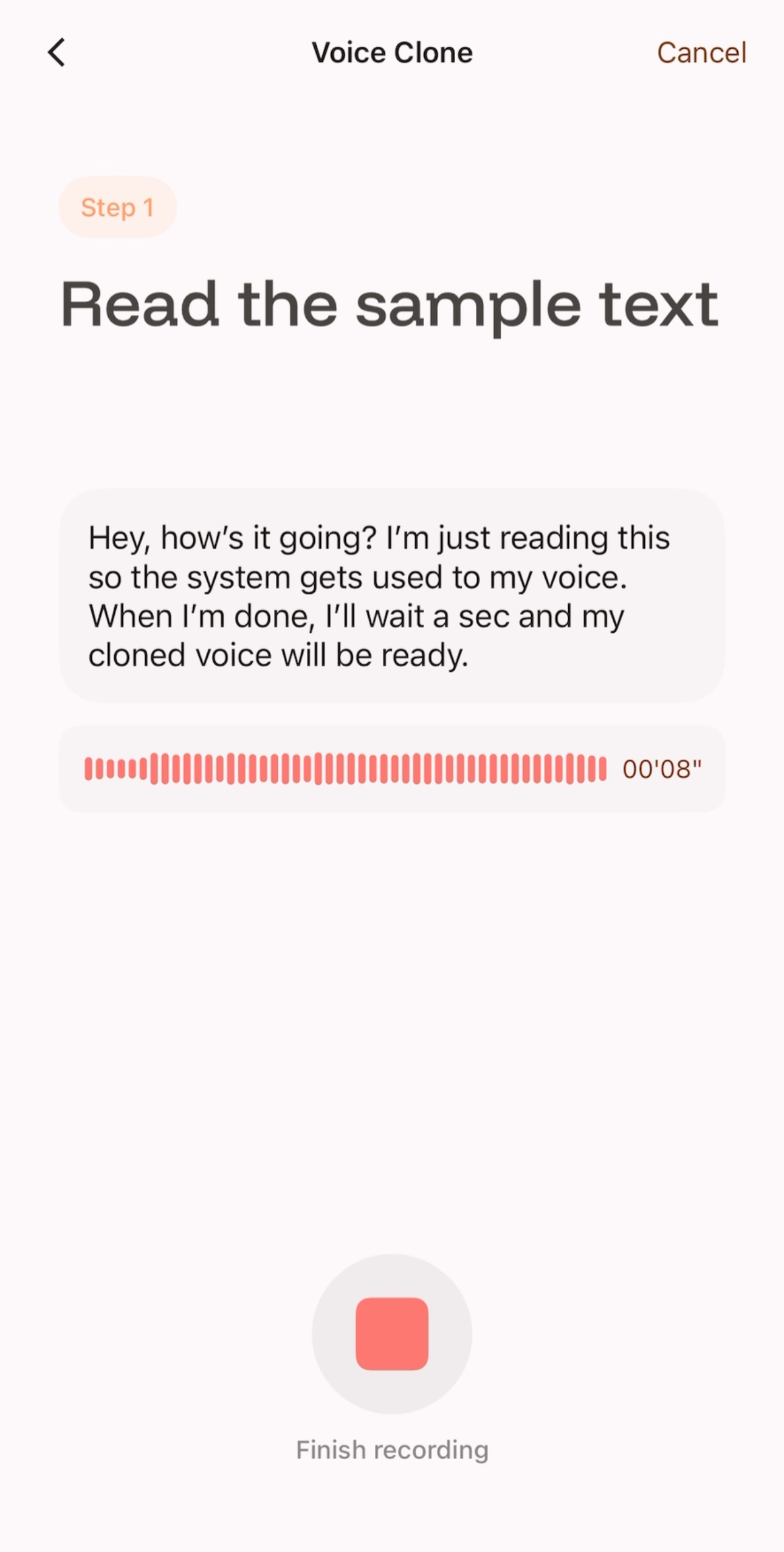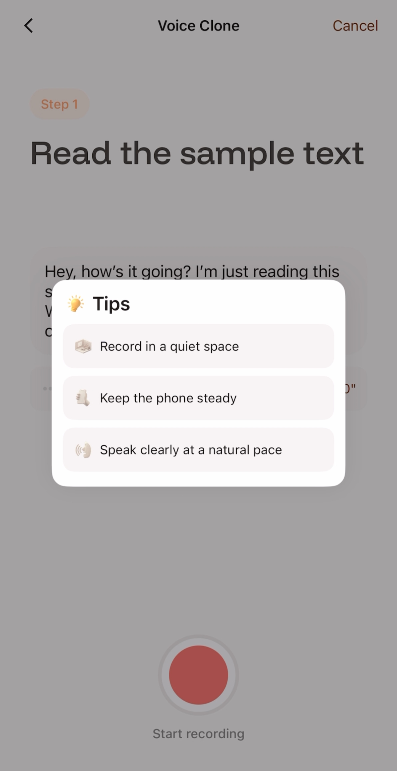 - 点击“Strat Recording”并按照Tips的要求,朗读指定样本文字,为保证生成的clone清晰稳定并尽可能接近你本人,建议阅读时长不少于8秒