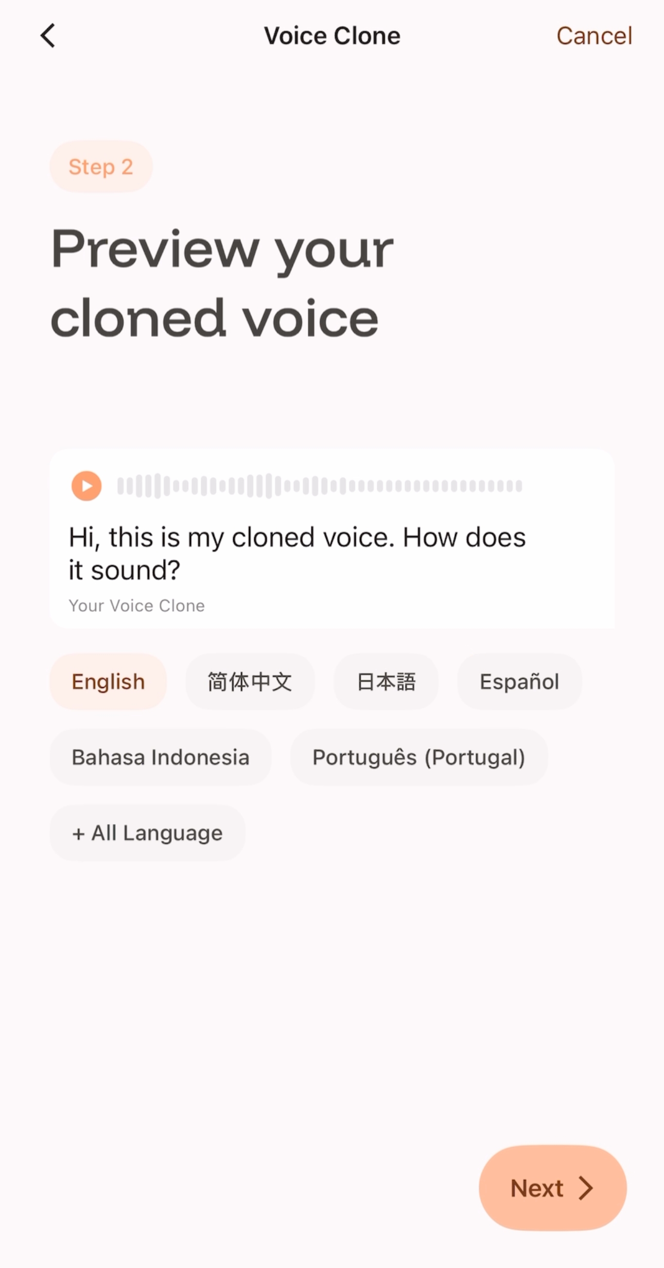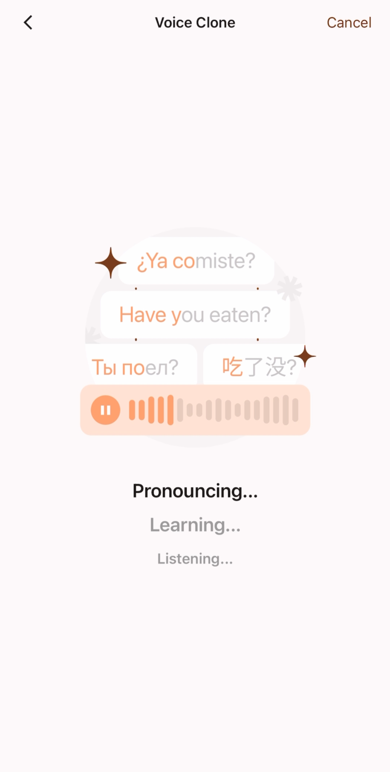 语音克隆功能可以让你的声音被复制成可合成多语言的音色。 完成采样后